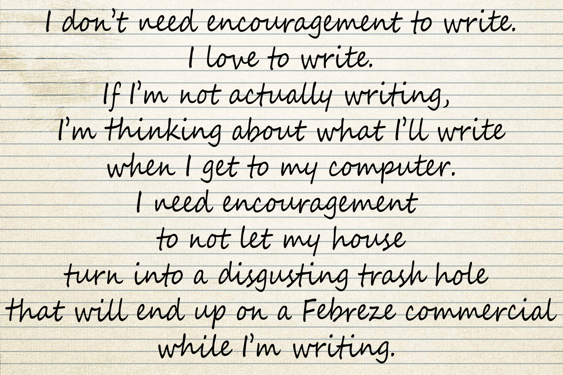 Here’s why: I use all those in-between times during the day to write (and by “write” I mean actual writing, editing, critiquing other’s writing, etc). I write while I eat breakfast. I write while the laundry’s in the washer or the chicken’s in the oven. I write while my kids are getting dressed. While some people do housework or go grocery shopping to procrastinate some kind of writing task, I use writing to procrastinate doing all that other stuff.